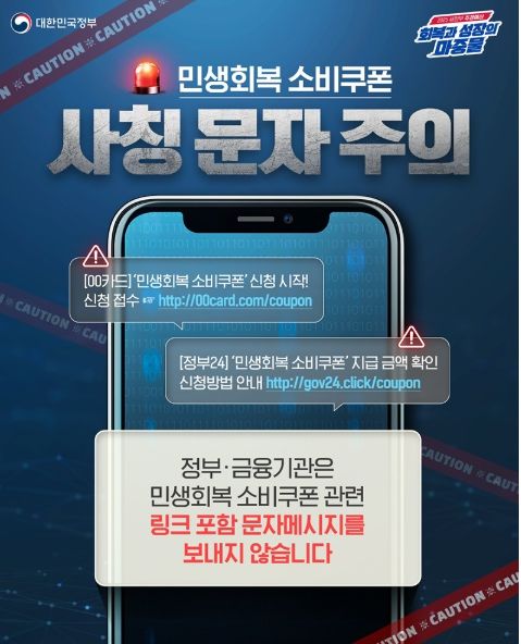 정부·금융기관은 민생회복 소비쿠폰 관련 링크 포함 문자메시지를 보내지 않습니다.