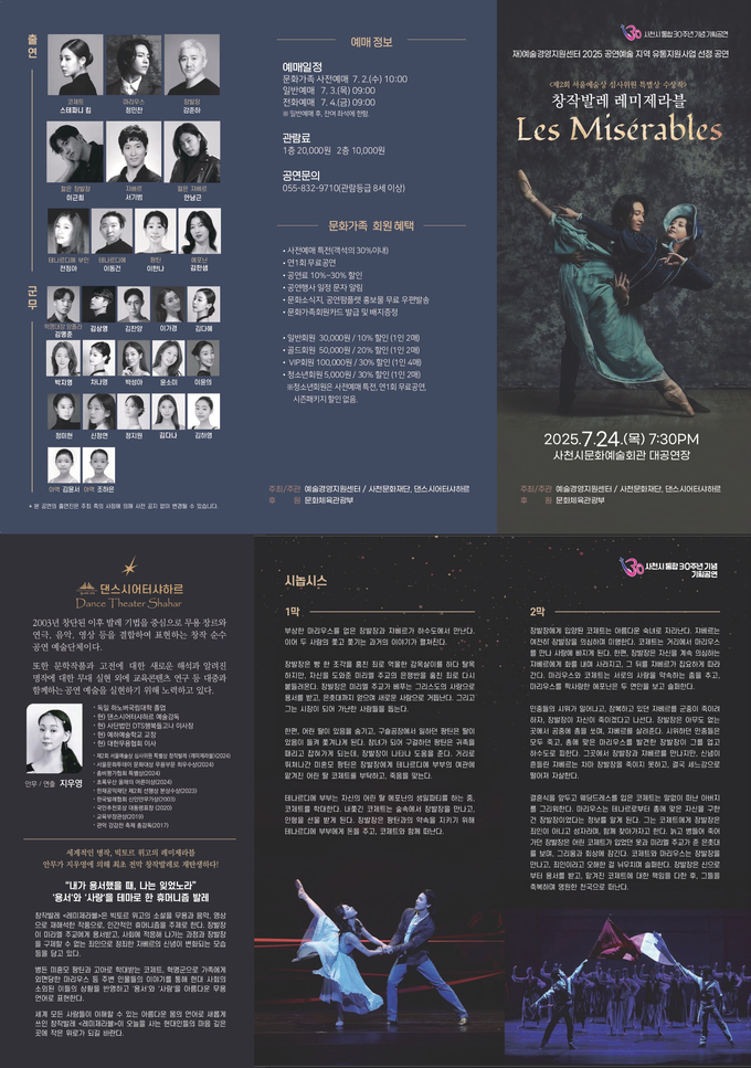 [경남도민뉴스=변정형 기자] 사천문화재단은 예술경영지원센터가 주최하고 문화체육관광부가 후원하는 ‘2025 공연예술지역유통지원사업’의 선정작으로 국비 64,800천원을 지원받아 창작발레 '레미제라블'를 선보인다. 이번 공연은 오는 7월 24일 오후 7시 30분, 사천시문화예술회관 대공연장에서 만나 볼 수 있다.