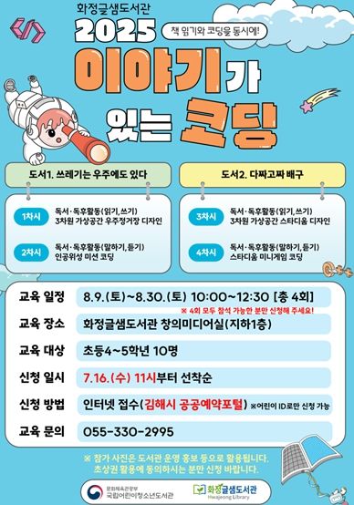 [경남도민뉴스=최미정 기자] 김해시 화정글샘도서관이 국립어린이청소년도서관에서 주최하는 ‘2025년 이야기가 있는 코딩’ 공모사업에 선정돼 어린이 디지털 독서 진흥 프로그램을 운영한다고 15일 밝혔다.