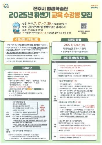 [경남도민뉴스=권중환 기자] 진주시 평생학습관은 ‘2025년 하반기 정기교육’수강생을 7월 17일부터 30일까지 14일간 70개 과목에 1,324명의 수강생을 모집한다.