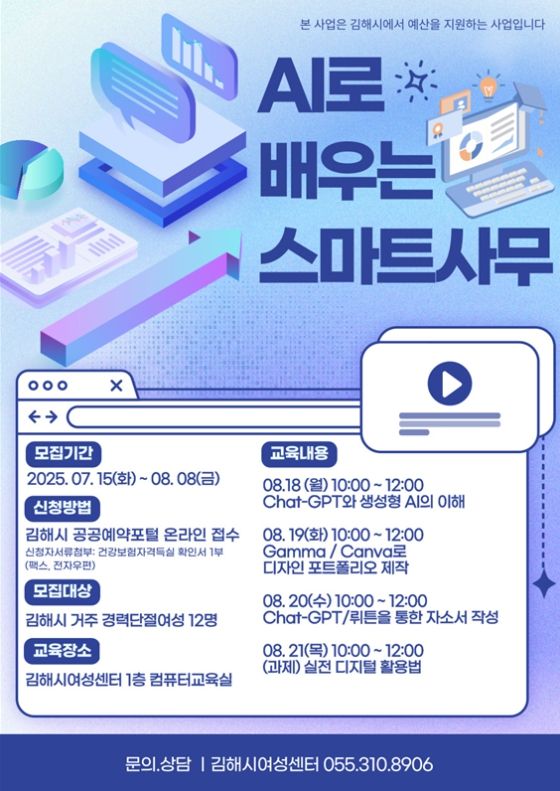 김해시여성센터는“AI와 디지털 툴을 실무에 접목할 수 있도록 도와 재취업을 희망하는 여성들에게 실질적인 도움이 될 것으로 기대한다”고 밝혔다.