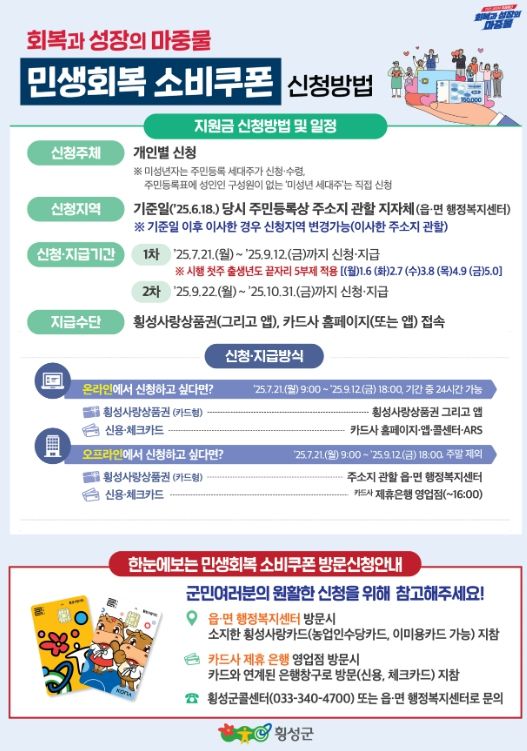 특히, 읍․면행정복지센터를 통해 직접 방문 신청할 경우, 보유 중인 횡성사랑카드(일반카드, 농업인수당카드, 이미용카드 등)를 지참하면 해당 카드에 소비쿠폰이 충전․지급되어 더욱 간편하고 편리하게 활용할 수 있다.
