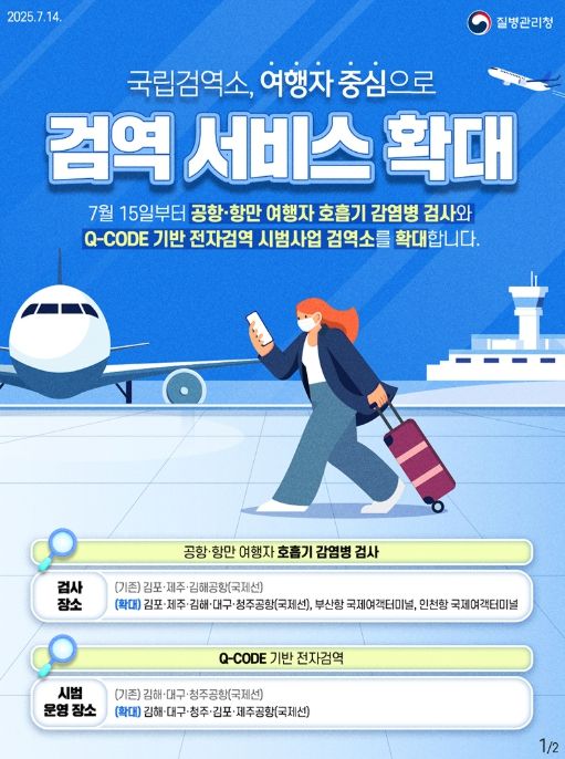 [경남도민뉴스= 기자] 7월 15일부터 공항·항만 여행자 호흡기 감염병 검사와 Q-CODE 기반 전자검역 시범사업 검역소를 확대합니다.