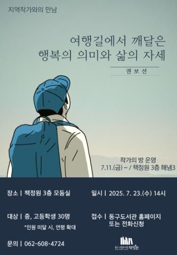 먼저 첫 번째 주자인 권보선 작가는 7~8월 책정원도서관 3층에서 작가의 방 전시를 선보일 예정이며, 23일 중·고등학생을 대상으로 ‘여행길에서 깨달은 행복의 의미와 삶의 자세’를 주제로 한 북토크를 펼친다.
