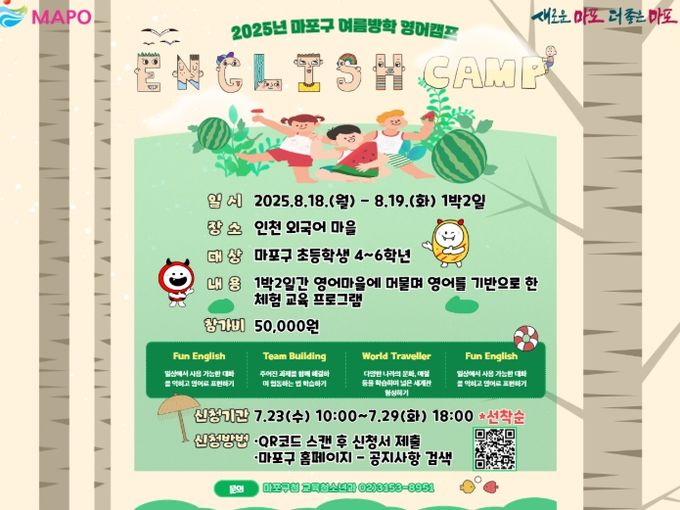 [경남도민뉴스=김완호 기자] 마포구는 지역 내 초등학생을 대상으로 영어에 대한 흥미와 자신감을 높이고, 실용 영어를 자연스럽게 습득할 수 있는 ‘2025년 여름방학 영어캠프’ 참여자를 모집한다.