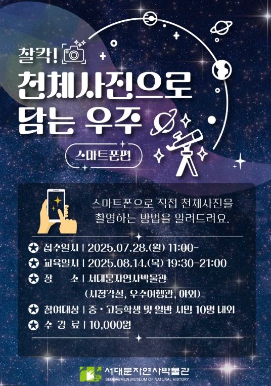 [경남도민뉴스=김완호 기자] 서대문구는 서대문자연사박물관에서 ‘찰칵! 천체사진으로 담는 우주 – 스마트폰 편’ 교육 강좌를 마련했다고 22일 밝혔다.