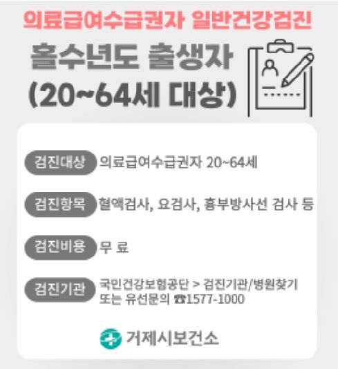 [경남도민뉴스=김부경 기자] 거제시보건소(보건소장 김영실)는 2025년 의료급여수급권자의 건강한 삶을 위해 무료 일반건강검진을 지원한다.