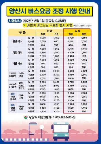 [경남도민뉴스=최미정 기자] 양산시는 8월 1일부터 시내·마을버스 요금을 인상하고, 동시에 어린이 버스요금 무료화를 시행한다고 밝혔다.