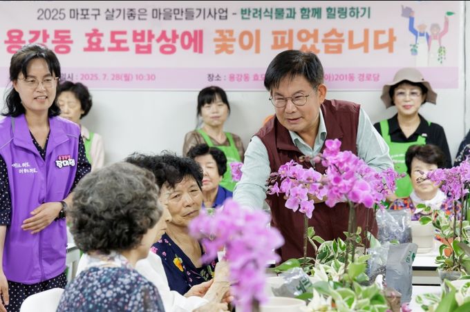 [경남도민뉴스=김완호 기자] 박강수 마포구청장은 7월 28일 오전 10시 30분, 용강동 효도밥상 4호점(태영아파트 201동 경로당)에서 열린 반려 식물 심기 활동에 참석해 어르신들과 함께 시간을 보냈다.