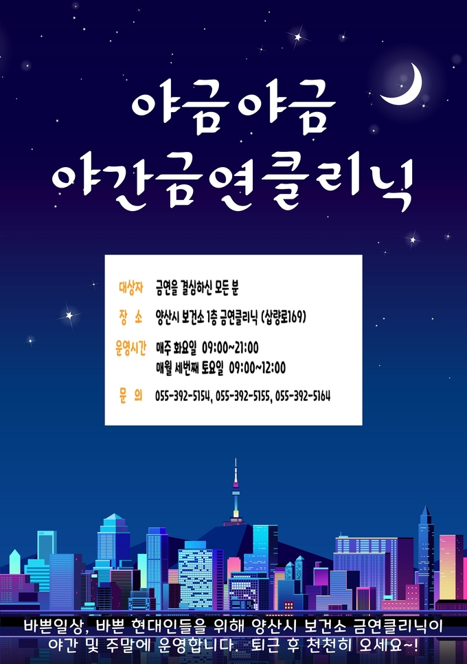 [경남도민뉴스=최미정 기자] 양산시 보건소는 최근 시범 운영한 야간 시간대 금연 클리닉 ‘야금야금’의 운영을 본격적으로 시작한다고 밝혔다.