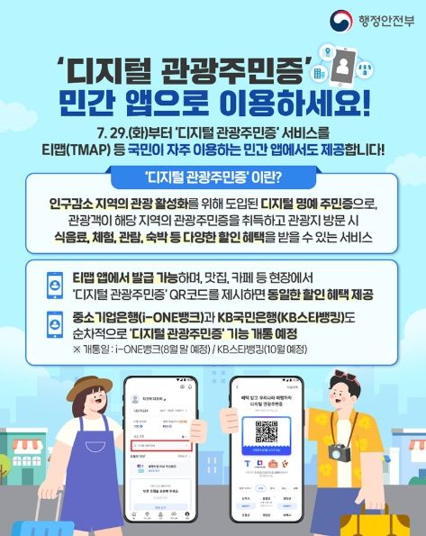 - 티맵 앱에서 발급 가능하며, 맛집, 카페 등 현장에서 '디지털 관광주민증' QR코드를 제시하면 동일한 할인 혜택 제공.