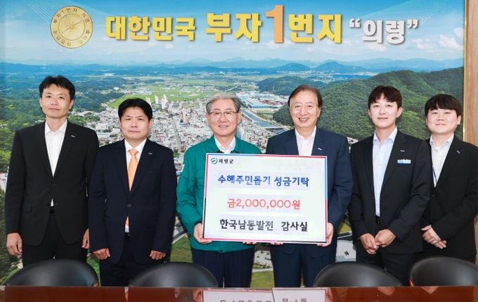 [경남도민뉴스=이상민 기자] 한국남동발전 감사실은 최근 집중호우로 큰 피해를 입은 경남 의령지역의 신속한 복구와 피해 주민지원을 위해 의령군 대의면행정복지센터를 방문하여 성금 200만원을 지난 31일 기탁했다.