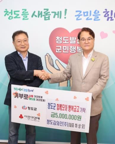 [경남도민뉴스=최민숙 기자] 청도군은 8월 1일 주식회사 청도감와인으로부터 지역사회복지 향상을 위해 운용 중인‘함께모아 행복금고’에 500만원의 기탁금을 기탁받았다고 전했다.