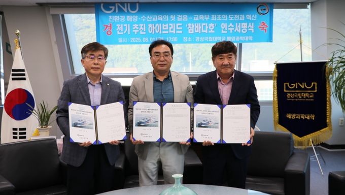 [경남도민뉴스=구인애 기자] 경상국립대학교는 8월 1일 오후 5시 해양과학대학 학장실에서 ‘교육부 최초 전기 추진 하이브리드 해양수산탐사실습선 참바다호 인수 서명식’을 개최했다.