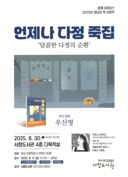 [경남도민뉴스=최미정 기자] 양산시립 서창도서관에서는 오는 8월 30일 오후 2시 2025년 경남의 책 선정작『언제나 다정죽집』의 저자 우신영 작가를 초청하여 작가와의 만남을 운영한다.