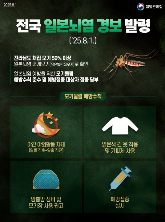 질병관리청은 8월 1일 모기 채집 조사에서 일본뇌염 매개 모기(작은빨간집모기)의 밀도가 경보 발령 기준에 도달하여, 전국에 일본뇌염 경보를 발령했다.