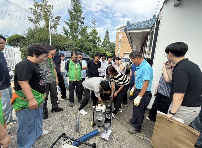 이번 훈련은 삼산배수펌프장 일원에서 행정복지센터 직원과 지역자율방재단 회원 50여 명이 참여한 가운데 실전 대응 능력 향상에 중점을 두고 엔진·전기 양수기 작동법, 장비별 특성과 주의사항 등 실무 중심의 교육과 침수 저감 핵심 장비인 이동식 차수판 설치 실습을 진행했다.