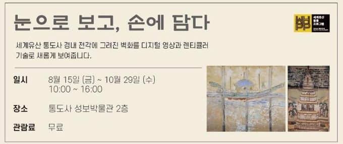 [경남도민뉴스=최미정 기자] 양산시는 8월 15일부터 10월 29일까지 2025년 세계유산 활용프로그램인 '눈으로 보고 손에 담다' 주제의 벽화 전시 프로그램을 통도사 성보박물관에서 상시 운영할 계획이다.