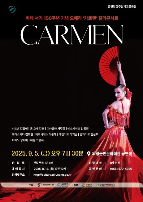 [경남도민뉴스=이상민 기자] 의령군은 프랑스의 대표적인 천재 작곡가 비제의 서거 150주년을 기념하는 ‘오페라 카르멘 갈라 콘서트’를 9월 5일 금요일 오후 7시 30분 의령군민문화회관에서 연다고 밝혔다.