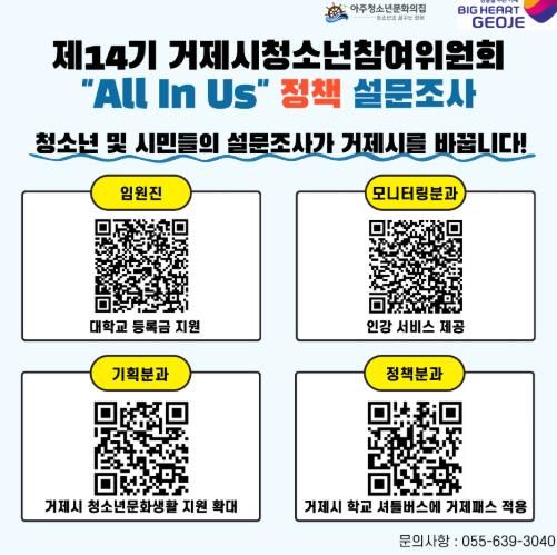 [경남도민뉴스=김부경 기자] 제14기 거제시청소년참여위원회 ‘All In Us’는 청소년 맞춤형 정책 제안을 위해 청소년과 거제시민을 대상으로 설문 조사를 9월 6일까지 실시한다.