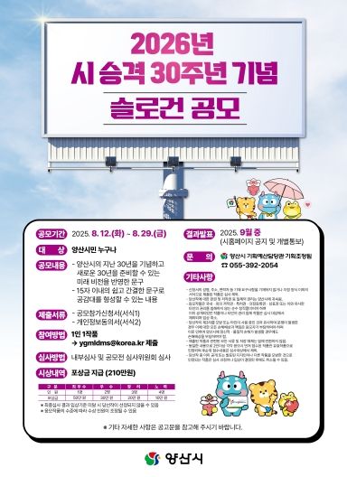 [경남도민뉴스=최미정 기자] 양산시는 2026년 시 승격 30주년을 기념하여 시민과 함께 만들어가는 슬로건 공모를 8월 12일부터 8월 29일까지 실시한다.