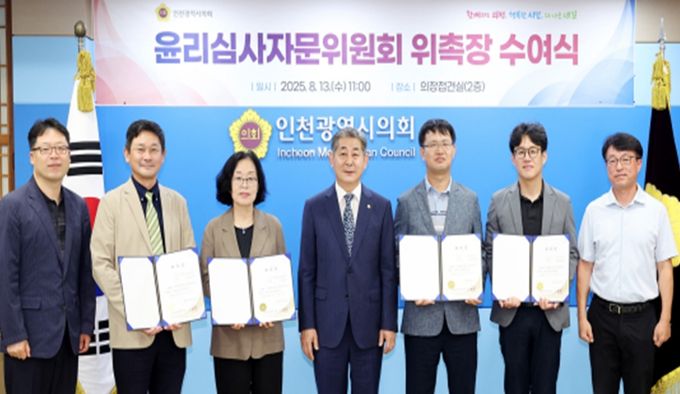 [경남도민뉴스=김용욱 기자] 인천광역시의회는 13일 의회 접견실에서 인천광역시의회 윤리심사자문위원회 위원 위촉장 수여식을 가졌다.