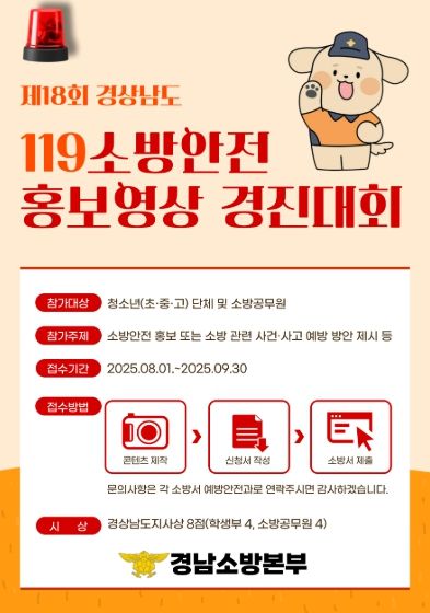 [경남도민뉴스=구인애 기자] 경상남도 소방본부는 오는 9월 30일까지 ‘제18회 경상남도 119소방안전 홍보영상 경연대회’ 참가작을 모집한다고 밝혔다.