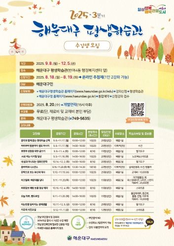 [경남도민뉴스=김채연 기자] 해운대구는 지역 주민을 위한 평생학습관 3분기 수강생을 모집한다. 3분기 강좌는 9월부터 12월까지 4개월간 운영된다.