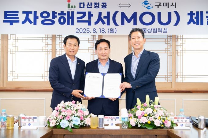 [경남도민뉴스=오창경 기자] 구미시와 향토기업 다산정공(대표 황득생)은 8월 18일 시청 국제통상협력실에서 김장호 구미시장, 박교상 구미시의회 의장, 황득생 다산정공 대표 등이 참석한 가운데 다산정공과 구미시 간 투자양해각서(MOU)를 체결했다.