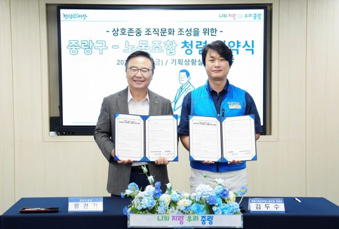 [경남도민뉴스=윤장희 기자] 중랑구는 8월 22일 중랑구노동조합과 함께 ‘청렴, 같이 말해요’ 협약을 체결하고, 직원 대표들과 자유로운 분위기 속 간담회를 진행했다.