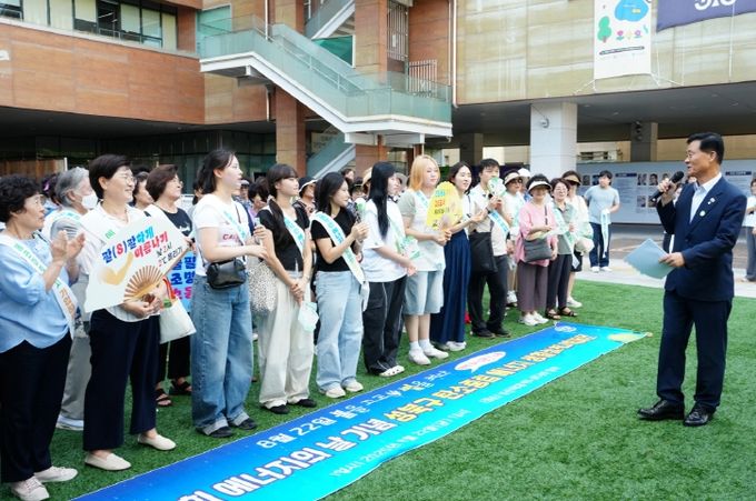 아울러 △저녁 9시 5분간 소등 △적정 실내온도 26도 유지 △낮 2시 2℃ 온도 올리기 △선풍기 대신 부채 사용하기 등 문구가 적힌 피켓을 들며 탄소중립 실천 의지를 알렸다.