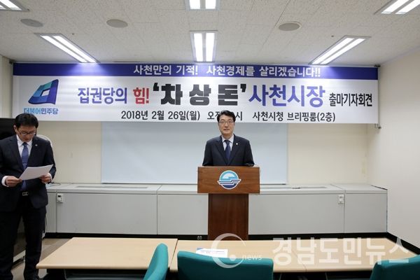 (사천/이형섭 기자) = 차상돈(60)사천경제살리기특별위원장이 26일 오전 10시. 오는 6·13 전국동시지방선거 때 사천시장 선거에 출마한다고 공식 선언했다. 차 특별위원장은 사천시청 브리핑룸에서 출마 기자회견을 열어 "낙후한 사천 경제를 살리고 지역민에게 무한봉사를 위해 시장 선거에 나섰다"고 밝혔다.