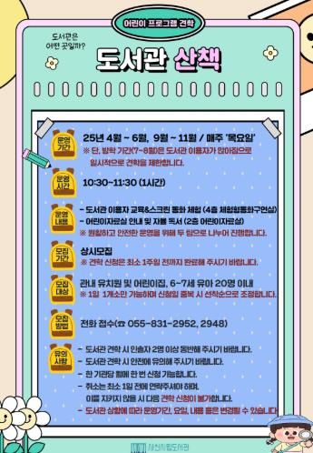 [경남도민뉴스=변정형 기자] 사천시립도서관은 오는 9월 4일부터 11월 27일까지 매주 목요일 오전 10시 30분부터 11시 30분까지 어린이 대상 견학 프로그램 ‘도서관 산책’을 운영한다.