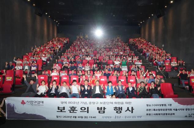 [경남도민뉴스=윤장희 기자] 중랑구는 광복 80주년을 기념해 지난 8월 30일 CGV 상봉점에서 보훈단체 회원 320여 명을 초청해 ‘보훈의 밤 [보훈단체 영화 관람] 행사’를 개최했다. 이번 행사는 광복의 역사적 의미를 함께 되새기고, 보훈가족에게 감사와 예우를 전하고자 마련됐다.