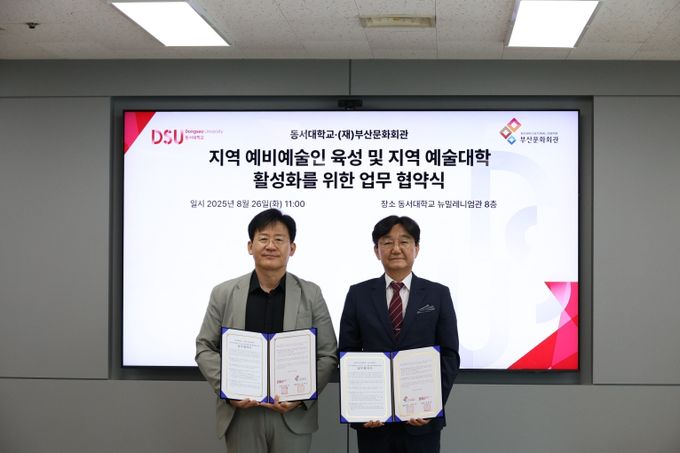 [경남도민뉴스=신석주 기자] (재)부산문화회관(대표이사 차재근)과 동서대학교(총장 장제국)은 8월 26일 동서대학교 산학협력관에서 지역 예비예술인 육성 및 발판 조성의 목적과 더불어 '2025 대학생 작품제작·참여지원 사업'을 위해 업무협약(MOU)을 체결했다.