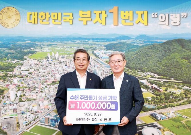 [경남도민뉴스=이상민 기자] 의령군은 최근 집중호우로 큰 피해를 입은 지역의 복구를 돕기 위해 광륜테크(주)남한우 회장이 성금 100만원을 기탁했다고 2일 밝혔다.