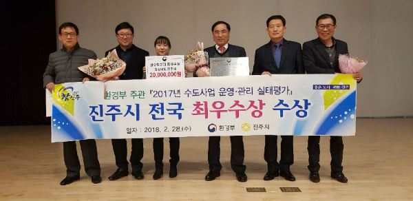 (진주/최광용 기자) = 진주시가 환경부에서 주최한 『2017년 수도사업 운영 및 관리실태』평가에서 전국 20만 이상 시 중 최우수 기관으로 선정, 28일 시상식에서 2천만원의 포상금을 획득하는 성과를 거뒀다.