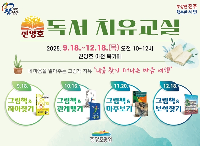 [경남도민뉴스=권중환 기자] 진주시는 시민의 정서적 안정과 가족 소통 증진을 위해 9월부터 12월까지 매월 1회‘진양호 독서 치유교실’을 운영한다.
