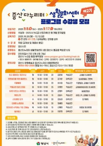 [경남도민뉴스=최미정 기자] 양산시는 오는 9월 8일부터 17일까지 10일간 ‘증산다누리터 생활문화센터 시범사업’제2기 시민 문화강좌 수강생을 모집한다.