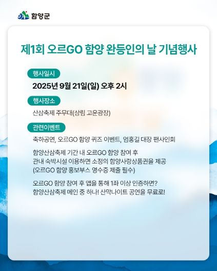 [경남도민뉴스=장광동 기자] 함양군은 오는 9월 21일 오후 2시, 상림공원 고운광장에서 ‘제1회 오르GO 함양 완등인의 날’ 기념행사를 개최한다고 밝혔다.