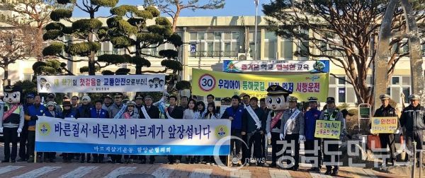 2일 함양군에 따르면 이날 오전 아동여성안전지역연대, 함양경찰서, 함양교육지원청, 바르게살기협의회, 모범운전자회 등 80여명이 참가한 가운데 함양초등학교 정문에서 등교하는 학생을 대상으로 성폭력·성매매·가정폭력·성희롱 등 4대 폭력 예방 홍보물을 나눠주며 캠페인을 펼쳤다.