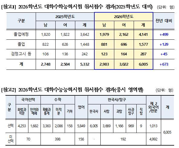 [경남도민뉴스=도문호 기자] 세종특별자치시교육청은 2026학년도 대학수학능력시험 응시원서 접수 결과, 지난해보다 673명(12.6%) 증가한 총 6,005명이 지원했다고 9일 밝혔다.