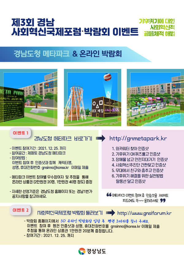 ![[경남도민뉴스] 경상남도가지난2일부터4일까지 개최된 제3회 경상남도 사회혁신 국제포럼․박람회의 후속행사로 기후위기 대응을 주제로 한메타버스(확장가상세계)와3d온라인 박람회를오는25일까지 운영한다고 밝혔다.](/data/photos/editor/2112/20211208103929_0b4c539856f858ee32f003368117c3cd_rfup.jpg)