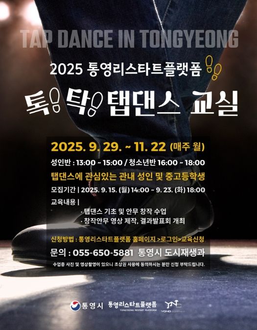 [경남도민뉴스=김부경 기자] 통영시는 통영리스타트플랫폼에서 성인과 중·고등학생을 대상으로 하는 〈통영예술창작학교: 톡!탁! 탭댄스 교실〉 수강생을 오는 15일 월요일부터 23일 화요일까지 모집한다고 11일 밝혔다.