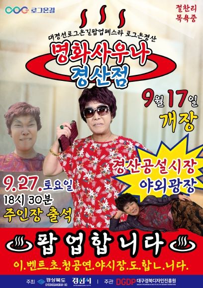이번 팝업스토어 기간 동안 9월 27일에는 경산공설시장 중앙광장에서 ‘이명화 트롯쑈’ 특별 초청 공연이 열린다. 이 외에도 관람객 참여형 무대 이벤트 ‘명화부녀회 단합대회’, 지역 예술인과 함께하는 ‘동행 버스킹’, 기발한 콘셉트의 ‘명화사우나 일일알바 구인공고’등 다채로운 프로그램이 진행된다.