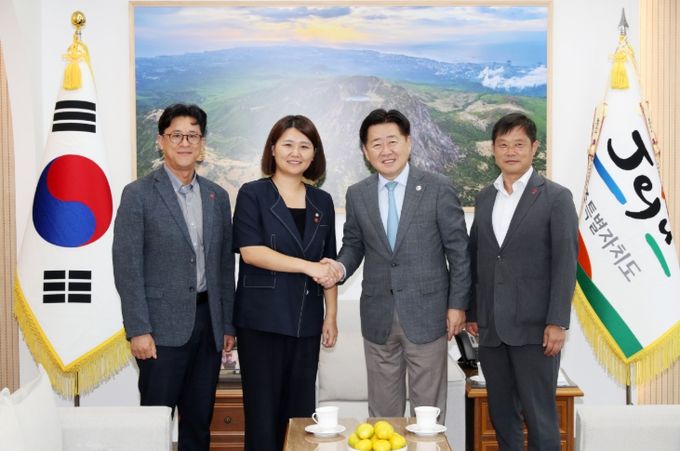 국회 문화체육관광위원회 소속인 손솔 의원은 이날 진보당 김명호 제주도당 위원장, 양영수 제주도의회 의원과 함께 도청을 찾아 제주지역 발전방안을 논의했다.