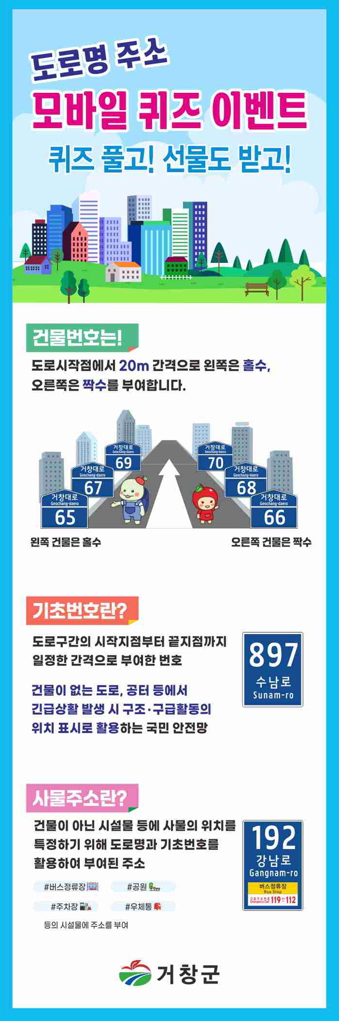 이번 이벤트는 거창한마당대축제 방문객을 대상으로 홍보 책자 배부, 도로명주소 교육, 모바일 퀴즈 참여 등을 통해 주소정책에 대한 이해도를 높이기 위해 마련됐다.