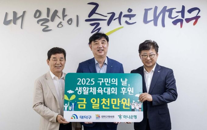 [경남도민뉴스=도문호 기자] 대전 대덕구는 하나은행 충청영업그룹으로부터 ‘2025년 구민의 날’과 ‘대덕구민 체육대회’를 위한 후원금 1000만원을 기탁받았다고 15일 밝혔다.
