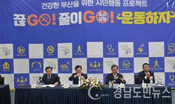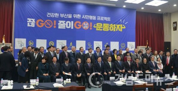 (부산/최록곤 기자) = 부산시는 지난 6일 2시 부산시청 대회의실에서 언론기관, 유료기관, 시민단체 등 150여 명이 모인 가운데 건강프로젝트 '끊고! 줄이고! 운동하자!' 선포식을 개최했다.