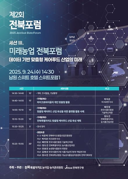[경남도민뉴스=최인태 기자] 전북특별자치도는 오는 24일 남원 스위트호텔에서 '데이터 기반 맞춤형 케어푸드 산업의 미래'를 주제로 '미래농업 전북포럼'을 연다고 22일 밝혔다.